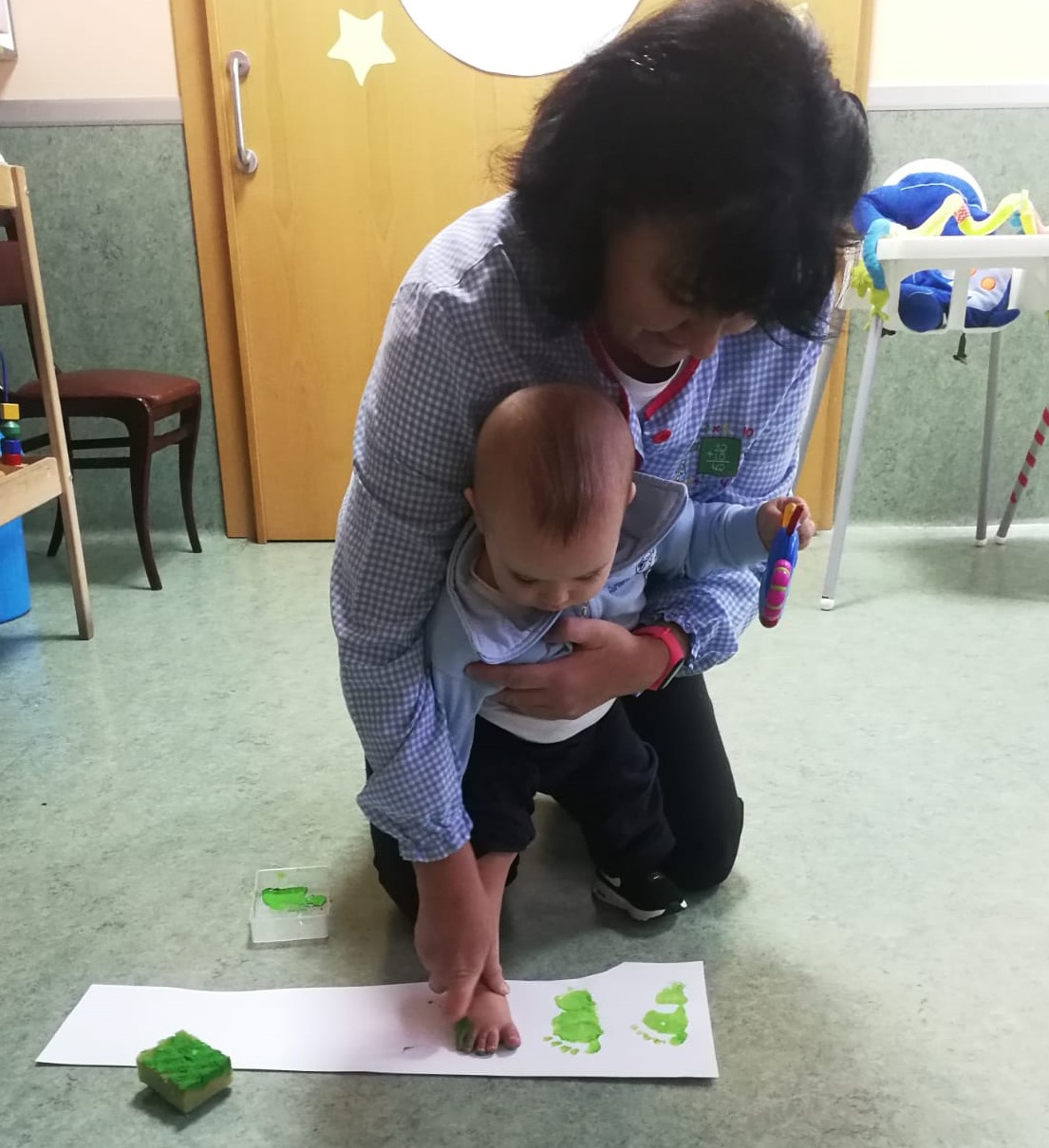 El día antes de hacer nuestra vendimia estuvimos aprendiendo donde nacen las uvas: ¡en las cepas de los majuelos! ...y nosotros quisimos crear nuestras cepas particulares, los bebés pintamos los racimos con el pié y los más mayores con los pinceles, y el resultado muy divertido y chulo.